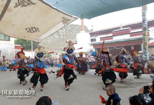 8月6日,在西藏堆龍德慶縣乃瓊鎮(zhèn)甲熱村舉行的雪頓節(jié)曬佛慶典上,甲熱村覺木隆藏戲團(tuán)的演員們?nèi)雸?chǎng)表演。