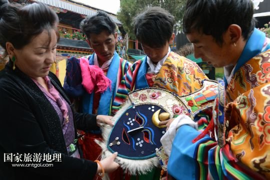 8月3日,在西藏堆龍德慶縣乃瓊鎮(zhèn),覺木隆藏戲團(tuán)團(tuán)長(zhǎng)瓊達(dá)(中)和演員們準(zhǔn)備參加鄰近幾個(gè)村的望果節(jié)演出。