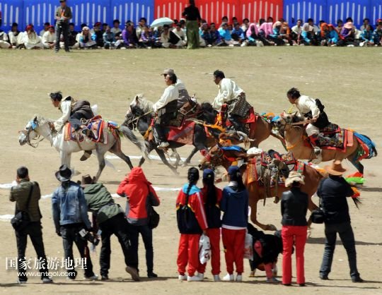 國家旅游地理 西藏那曲8月10日訊 8月10日,藏族牧民在進行跑馬比賽。當日,一年一度的藏北“恰青”賽馬藝術旅游節(jié)開幕,牧民們相聚那曲賽馬場,載歌載舞慶祝豐收。 /新華社記者唐召明攝