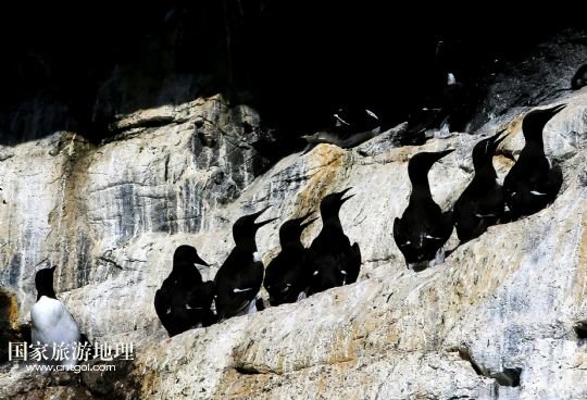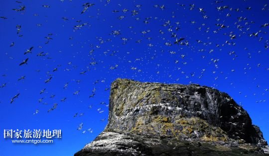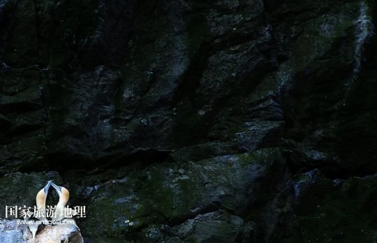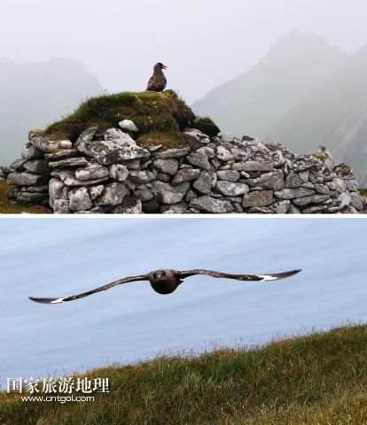 登上圣基爾達(dá)島并非易事,記者因風(fēng)高浪大在外赫布里底群島等待多日才有船出海。僅可乘載10余人的小船在風(fēng)浪中穿行了近3個(gè)小時(shí),圣基爾達(dá)島終于出現(xiàn)在霧色籠罩的海面上。島上散落著十余座已經(jīng)荒蕪破敗的石舍和幾百個(gè)儲(chǔ)物石室,這些殘存的遺跡早已成為野羊與海鳥(niǎo)的巢穴,人類反而成為外來(lái)的訪客。人類文明的消失為一些稀有的物種和瀕臨滅絕的鳥(niǎo)類提供了安全的棲息地。島上陡峭的山坡隨處可見(jiàn)野羊悠然漫步,而那些嶙峋的峭壁和海礁則棲息著數(shù)十萬(wàn)只各類海鳥(niǎo)。世界上最大的塘鵝群——約6萬(wàn)對(duì)塘鵝在這座海島及附近的海礁上繁衍生息。