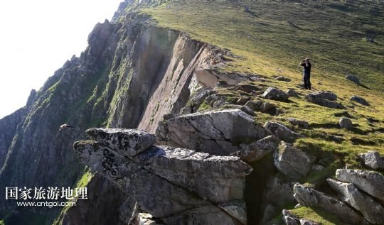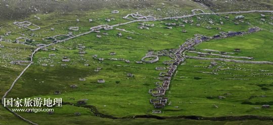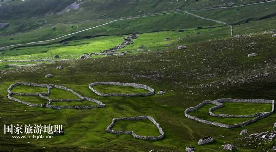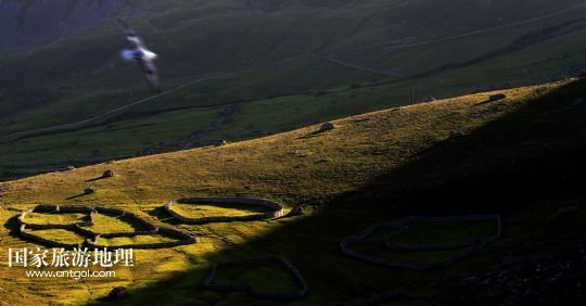 國(guó)家旅游地理 英國(guó)倫敦8月14日訊 在圣基爾達(dá)島已經(jīng)遺棄的村落旁的山坡上,有用石頭圍墻圈起的一塊塊耕地。當(dāng)年在島上定居的村民在這些石圈內(nèi)鋪墊海藻,種植少量谷物。一個(gè)個(gè)形狀各異的石圈保護(hù)著這些寶貴的谷物免遭風(fēng)暴與家畜的侵害(7月19日攝)。