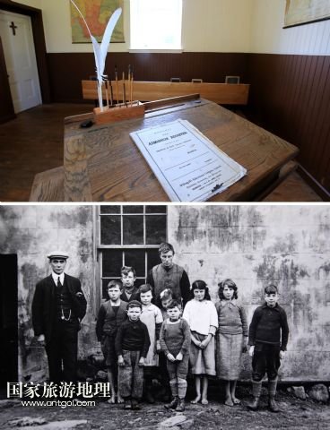 上圖,圣基爾達(dá)島上只有一個(gè)教室,一排課桌的小學(xué)校內(nèi)景(7月19日攝)。學(xué)校后來(lái)經(jīng)過(guò)重新整修。下圖,當(dāng)年島上學(xué)校師生的合影(資料照片,蘇格蘭國(guó)家信托基金會(huì)提供)。