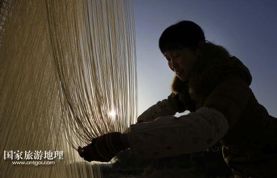 據(jù)了解,秦家圈村有冬季制作手工拉面迎新年的傳統(tǒng)。村民經(jīng)和面、發(fā)酵、盤條、拉面、晾曬等多道工序,手工制作成細潤綿長、風味獨特的面條。制面期間,潔白的線面宛若銀絲在風中飄蕩,成為鄱陽湖畔一道別致的鄉(xiāng)村景觀。 /新華社發(fā)(傅建斌 攝)
