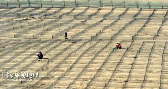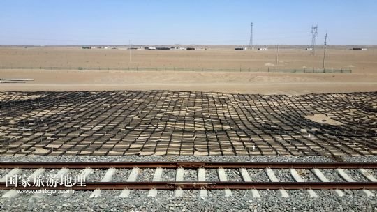 國家旅游地理 內蒙古阿拉善4月21日訊 錯落布局在內蒙古臨策鐵路(臨河——策克)旁的網格沙障(4月18日攝)。穿越我國北疆內蒙古阿拉善高原大漠的呼和浩特鐵路局臨策鐵路沿線有400多公里“無人區(qū)”,這里常年干旱少雨、風沙肆虐、植被稀少、人跡罕至,30多萬平方公里的荒漠、戈壁縱橫交錯,自然條件極度惡劣。