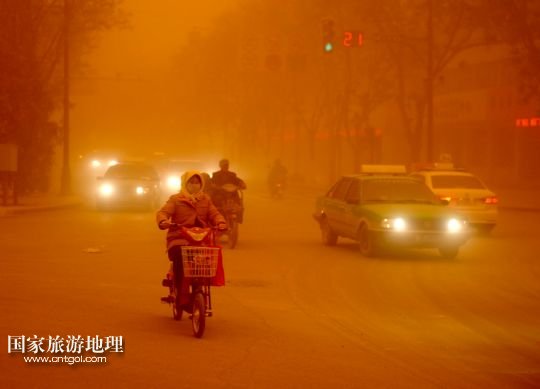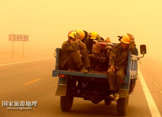 國家旅游地理 甘肅酒泉4月23日訊 4月23日,一輛拉載公路施工人員的三輪車在沙塵暴中行駛在酒泉市瓜州縣城郊的公路上。當(dāng)日,甘肅省酒泉市的敦煌市、瓜州縣等地遭受特強(qiáng)沙塵暴襲擊,最小能見度不足20米。當(dāng)日下午,酒泉市氣象臺發(fā)布沙塵暴紅色預(yù)警信號。 /新華社記者 聶建江 攝