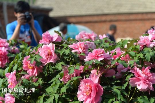 5月23日,游客在內(nèi)蒙古寧城縣長皋村烏氏家族的庭院里拍攝的盛開的牡丹花。