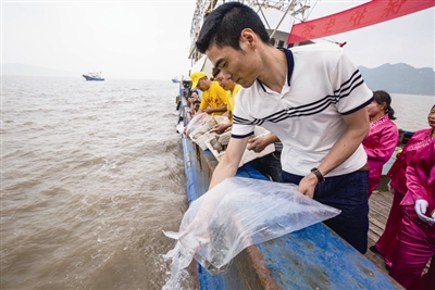 漁民在檀頭山海域放生黃魚苗和海龜。