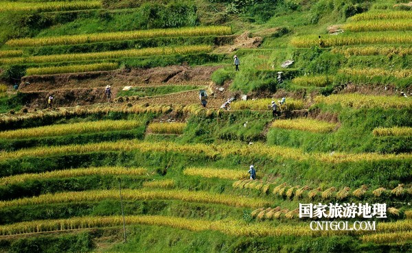 9月5日,貴州省黔東南苗族侗族自治州從江縣加榜鄉(xiāng)黨扭村和加車村近萬畝水稻開鐮收割。圖為:腰帶梯田上的繁忙。